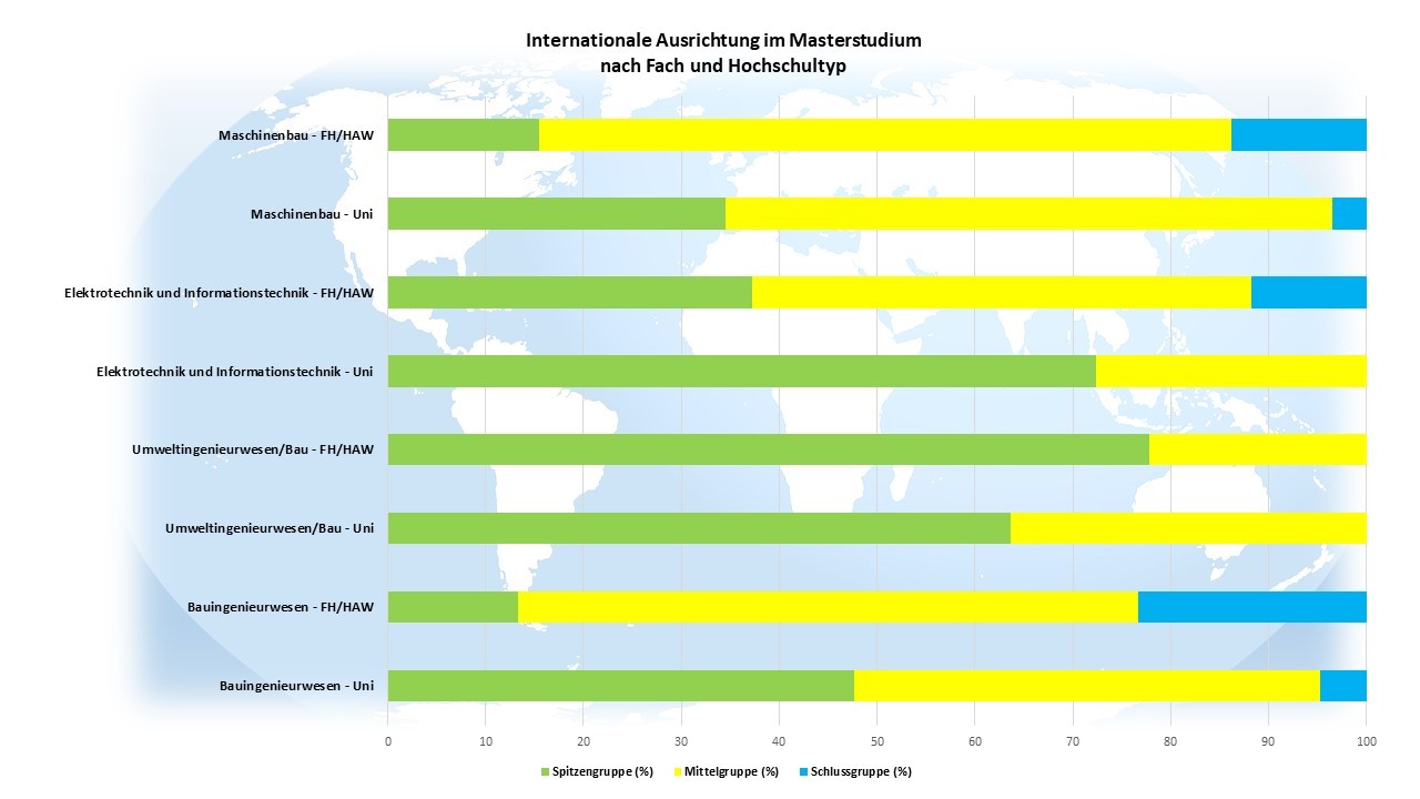 Im aktuellen Online-Ranking sind ab sofort die Urteile der Masterstudierenden in den Fächern Psychologie, Elektrotechnik und Informationstechnik, Maschinenbau, Bauingenieurwesen und Umweltingenieurwesen/Bau zu finden. Die Ergebnisse zeigen: Ingenieurwissenschaftliche Masterstudiengänge sind für Studierende aus dem Ausland besonders attraktiv. Die Fächer Umweltingenieurwesen/Bau an Fachhochschulen/HAW und Universitäten sowie Elektrotechnik und Informationstechnik an Universitäten zeichnen sich bundesweit durch eine sehr starke internationale Ausrichtung aus, über zwei Drittel der untersuchten Studiengänge erreichen bei diesem Kriterium die Spitzengruppe.
