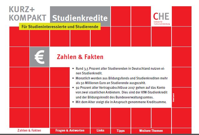 Der CHE-Studienkredit-Test 2019 entstand in Zusammenarbeit mit dem Handelsblatt und erscheint in diesem Jahr in seiner 14. Auflage. Er bewertet anhand von 21 Einzelkriterien Vor- und Nachteile von 49 aktuell verfügbaren Studienkreditangeboten. Datenbasis sind Selbstauskünfte der Anbieter. Mit seinen zahlreichen Detailinformationen bietet er eine transparente Marktübersicht für Studierende und Studieninteressierte. Zusätzlich kann man anhand von Tabellen eine eigene Bedarfskalkulation erstellen.