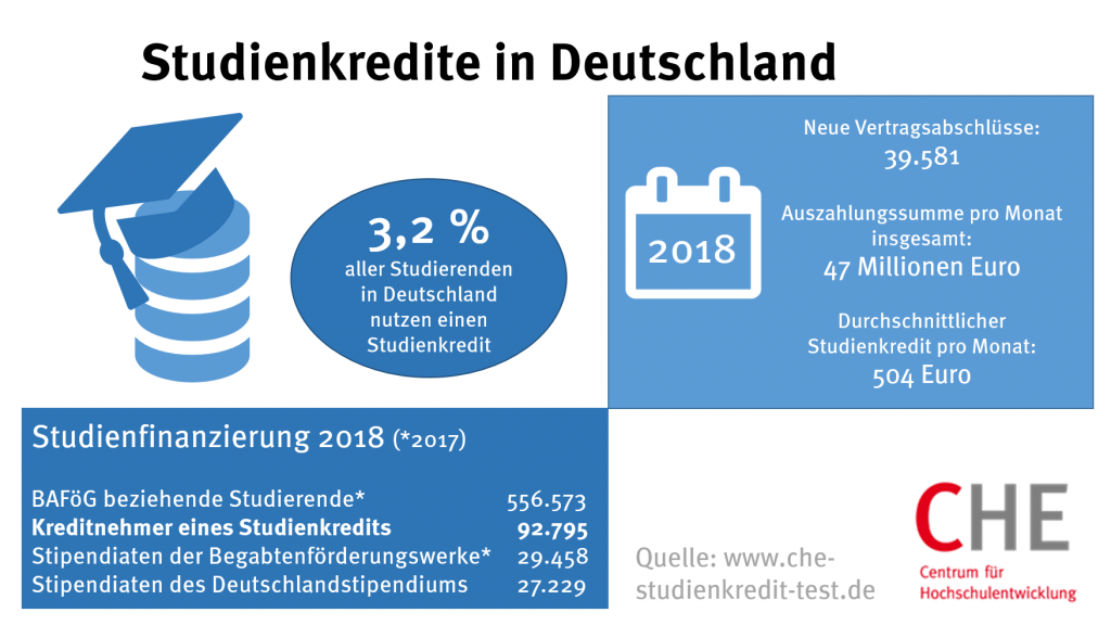 Laut Anbieterbefragung durch das CHE Centrum für Hochschulentwicklung werden von Banken, Darlehenskassen und Bildungsfonds monatlich rund 47 Millionen Euro an Studierende ausgeschüttet – im Durchschnitt 504 Euro pro Person. Marktführer sind weiterhin der KfW-Studienkredit und der Bildungskredit des Bundesverwaltungsamtes. Mehr als 90 Prozent aller Verträge im Jahr 2018 wurden bei den beiden staatlichen Anbietern unterzeichnet.