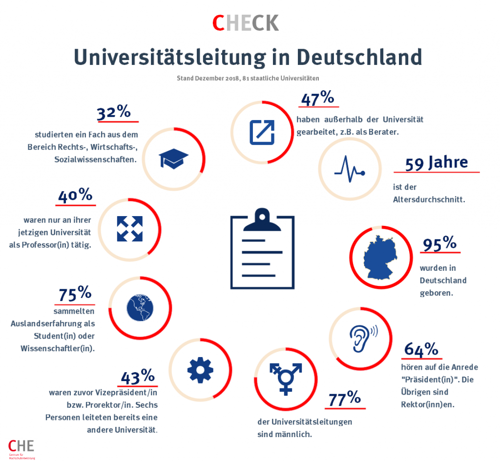 Autorin der Publikation „CHECK – Universitätsleitung in Deutschland“ ist Isabel Roessler. Die mehr als 2.500 analysierten Daten stammen aus im Netz veröffentlichten Lebensläufen der Hochschulleitungen, ergänzt durch Nachfragen bei Präsidien und Rektoraten. Enthalten sind die Daten aller 81 öffentlich-rechtlichen Universitäten – ausgenommen Pädagogische Hochschulen und Kunstuniversitäten. Stand der Erhebung ist Dezember 2018.