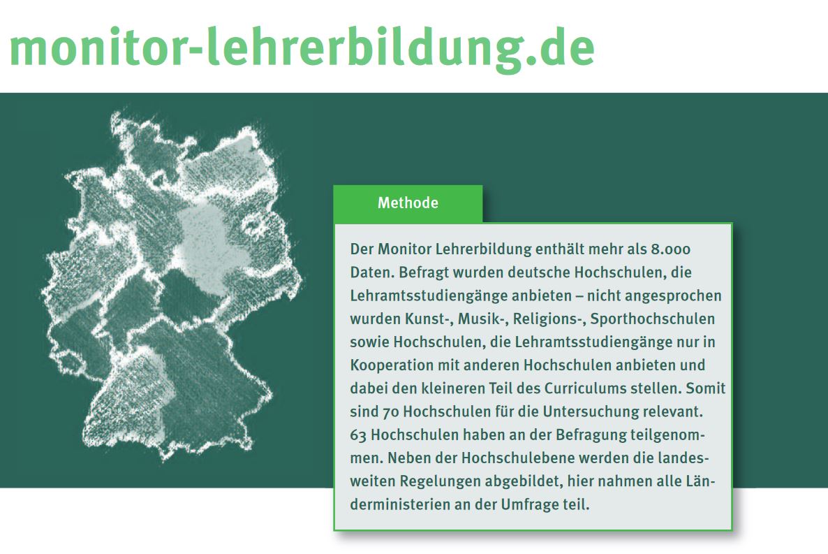 Im Monitor Lehrerbildung sind relevante Daten zu dieser ersten Phase der Lehrerbildung übersichtlich dargestellt. 63 Hochschulen und alle 16 Länder beteiligten sich an der Erhebung des Monitor Lehrerbildung 2016. Sämtliche Daten sowie viele weitere Informationen zum Thema sind unter www.monitor-lehrerbildung.de frei zugänglich.