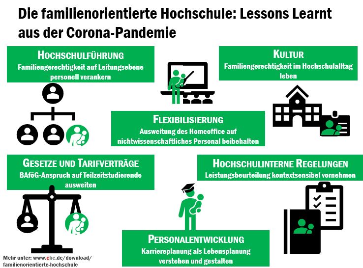 Bemerkenswert war dabei, dass diejenigen Hochschulen während der Corona-Pandemie einen Vorteil hatten, bei denen das Thema Familiengerechtigkeit bereits gut strukturell verankert war. Dies bedeutet, dass etwa neben eigenen Service-Stellen und Familienbüros das Thema auch auf Leitungsebene, etwa in einem Prorektorat, personell verortet ist. Für solche Hochschulen war es leichter, ad hoc neue Unterstützungsinstrumente zu schaffen oder bestehende Maßnahmen, wie die Arbeit im Homeoffice, auszubauen.