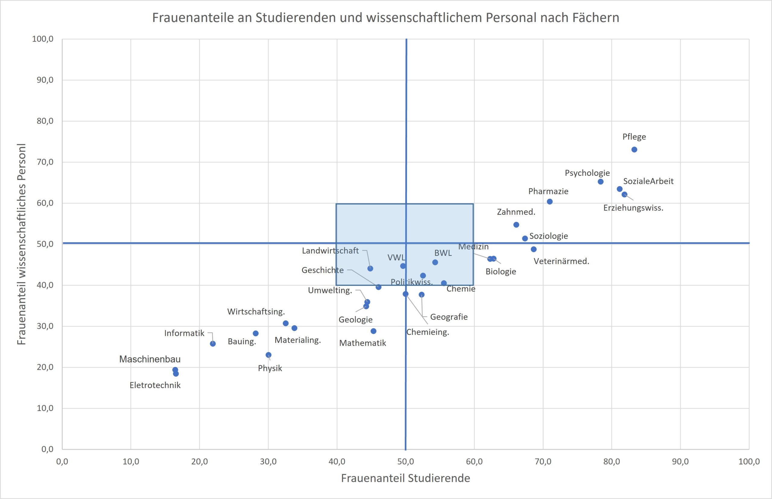 Blickt man auf einzelne Fächer bestätigen sich traditionelle Geschlechter-Unterschiede. Auch wenn die Anteile von Frauen und Männern in einigen Fächer (z.B. in BWL, VWL, Agrarwissenschaften) in etwa ausgewogen sind, gibt es nach wie vor etliche (fast) reine Frauen- und Männerfächer. Zu den Fächern, in denen die überwiegende Zahl der Studierenden und oft auch des wissenschaftlichen Personals weiblich sind, zählen Pflege, Erziehungswissenschaft, Psychologie, Medizin, und Zahnmedizin – aber auch Pharmazie.