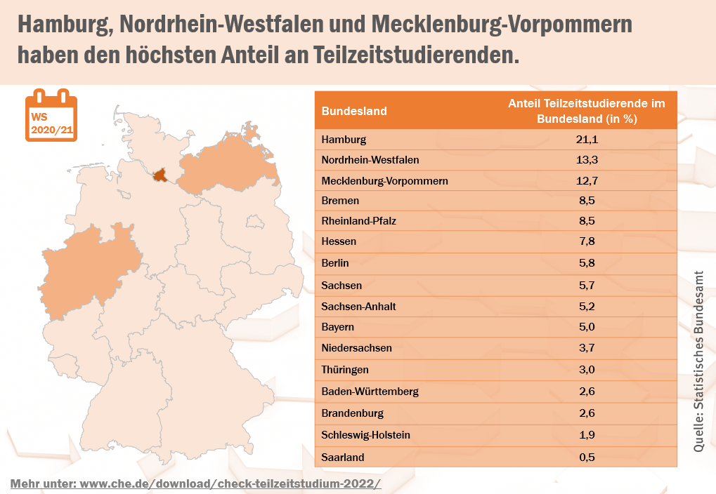 Im Ländervergleich weist Hamburg die höchste Quote auf. Im Staatstadt absolviert rund ein Fünftel der Studierenden ein Studium nicht in Vollzeit. Dahinter folgen Nordrhein-Westfalen und Mecklenburg-Vorpommern mit Anteilen von 13,3 bzw. 12,7 Prozent.