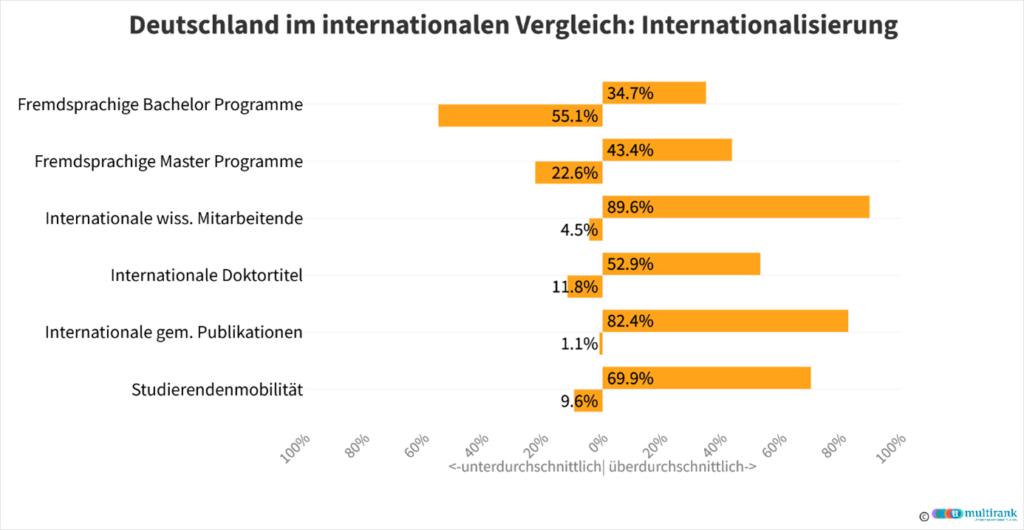 Insgesamt liegen die deutschen Hochschulen bei zwei Drittel aller Werte der Internationalisierungs-Indikatoren über dem weltweiten Durchschnitt. Die Technische Universität München sowie mehrere private Hochschulen, die Kühne Logistik University, die Jacobs University, die Frankfurt School of Finance & Management und die WHU- Otto Beisheim School of Management, sind bei allen Kriterien, die für Internationalität erhoben wurden, in den Topgruppen. Es folgen die Universitäten in Siegen und Konstanz sowie die Universität des Saarlandes mit jeweils fünf Topplatzierungen.