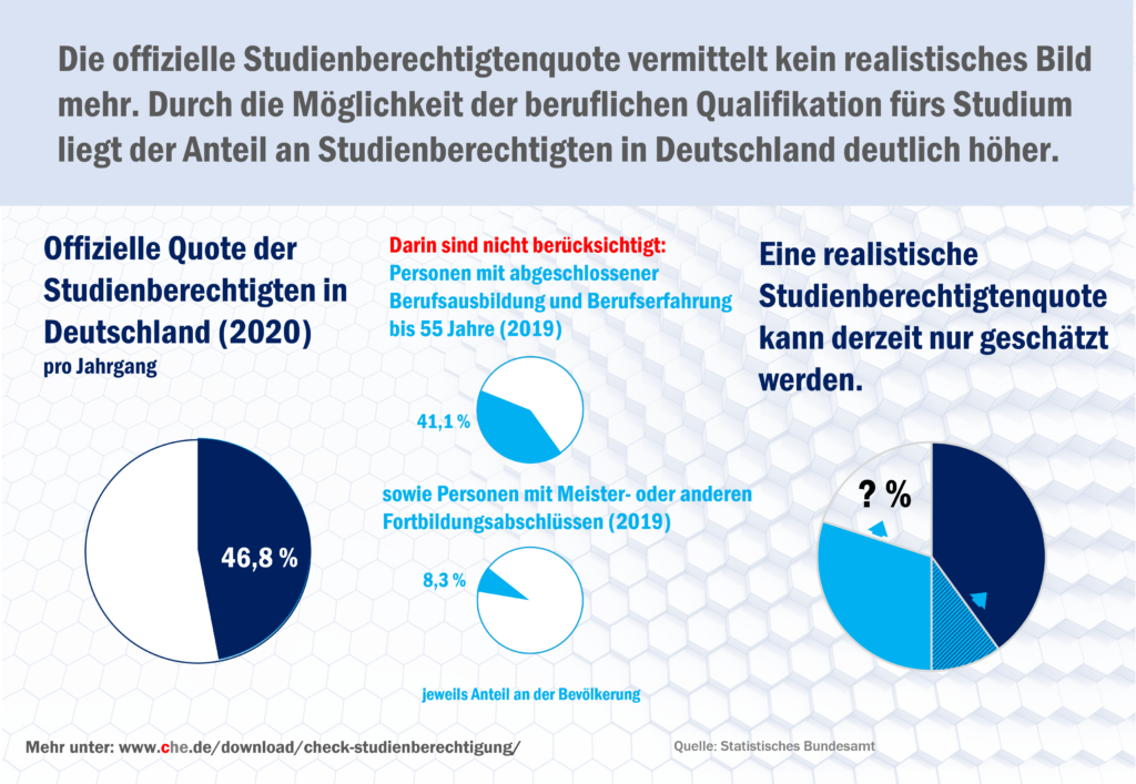 Das Studium an einer deutschen Hochschule steht deutlich mehr Menschen offen, als die offiziellen Statistiken bisher nahelegen. Zu diesem Ergebnis kommt eine neue Publikation des CHE Centrum für Hochschulentwicklung. Seit über einem Jahrzehnt sind in Deutschland nicht nur Personen mit schulischer Hochschul- und Fachhochschulreife studienberechtigt, auch Menschen mit einer abgeschlossenen Berufsausbildung plus Berufserfahrung steht dieser Weg unter bestimmten Bedingungen offen. Deshalb müsste die offizielle Quote der Studienberechtigten deutlich nach oben korrigiert werden.