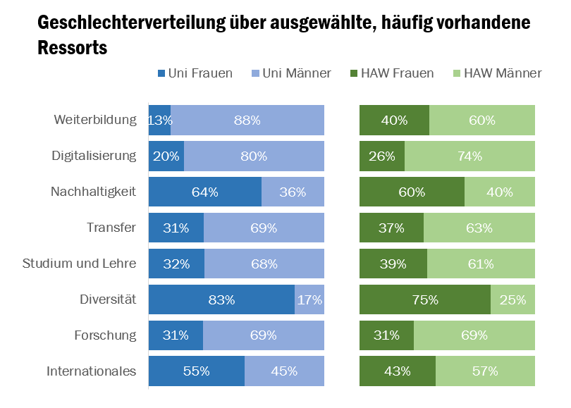Aktuell sind an den 188 Universitäten und Hochschulen für angewandte Wissenschaften (HAW) 217 Vizepräsidentinnen, Pro- oder Konrektorinnen im Amt. Der Frauenanteil auf der zweiten Führungsebene an staatlichen deutschen Hochschulen liegt damit bei 39 Prozent. Die Frauenquote liegt bei den Vizeleitungen somit deutlich höher als bei den Hochschulleitungen, wo der Anteil nur 29 Prozent entspricht. Die höchsten Anteile weiblicher Vizestellen im Ländervergleich finden sich mit 67 Prozent in Bremen, Hamburg und Sachsen-Anhalt.