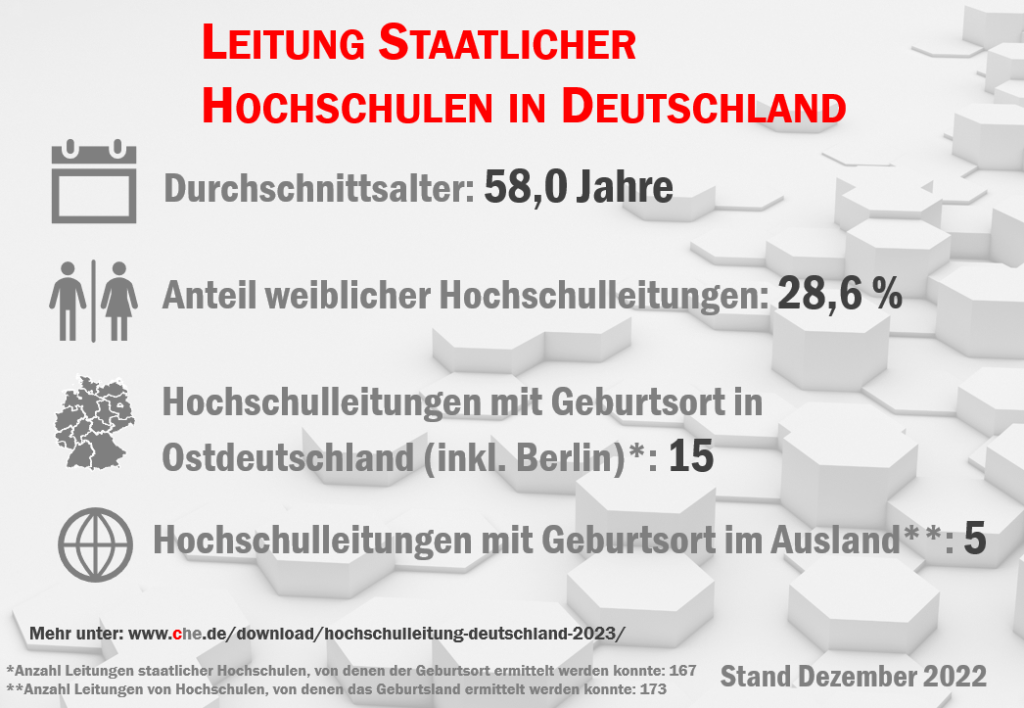 Der „CHECK Hochschulleitung in Deutschland – Update 2023“ bietet aktualisierte Daten aus den bisherigen Lebenslaufanalysen „CHECK Universitätsleitung in Deutschland“ und „CHECK HAW-Leitungen in Deutschland“. Berücksichtigt wurden die im Netz veröffentlichten Lebensläufe von 182 Leitungen staatlicher Hochschulen, ergänzt durch Nachfragen bei Präsidien und Rektoraten. Stichtag der Erhebung bzw. Aktualisierung war der 31.12.2022. Autorin aller genannten Publikationen ist Isabel Roessler. Sämtliche Grafiken der Publikation sind frei verfügbar im CHE Flickr-Kanal.