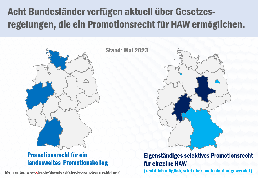 Mit Schleswig-Holstein, Bremen, Berlin, Sachsen-Anhalt, Nordrhein-Westfalen, Hessen, Baden-Württemberg und Bayern verfügen aktuell acht Länder über Gesetzesregelungen, die ein Promotionsrecht für HAW ermöglichen. Nordrhein-Westfalen, Baden-Württemberg und Schleswig-Holstein setzen auf das Promotionskolleg-Modell. Ein praktiziertes eigenständiges selektives Promotionsrecht gibt es mittlerweile in Hessen und Sachsen-Anhalt. Rechtlich möglich ist es mittlerweile auch in Bayern, Berlin und Bremen, wird hier aber noch nicht angewendet.