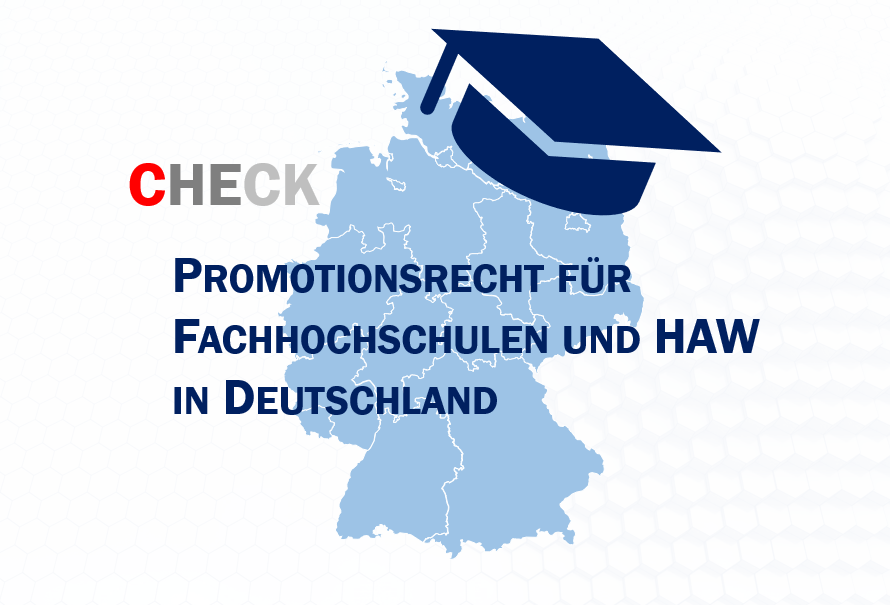 Der „CHECK Promotionsrecht für Fachhochschulen und HAW in Deutschland “ bietet einen schnellen visuellen Überblick über die Modelle der Promotion für und mit HAW in den 16 Bundesländern. Grundlage ist u.a. eine Analyse der entsprechenden Landeshochschulgesetze sowie der Daten des Statistischen Bundesamtes. Autor*innen des CHECKs sind Ulrich Müller und Isabel Roessler. Sämtliche Grafiken der Publikation sind frei verfügbar im CHE Flickr-Kanal.