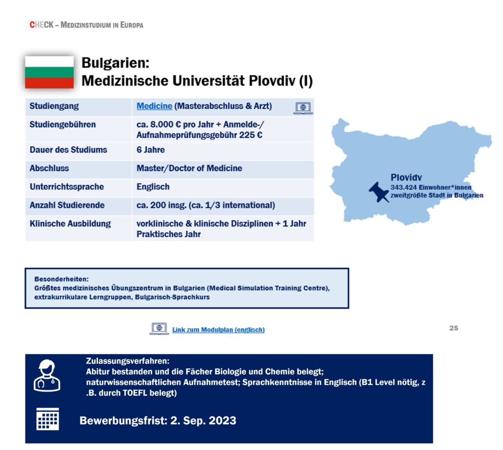 Der „CHECK Medizinstudium in Europa“ bietet einen Überblick über das internationale Angebot an Studiengängen der Humanmedizin für deutsche Studierende. Er umfasst Informationen zum nationalen Medizinstudium an 22 Hochschulen in Österreich, der Schweiz und den Niederlanden. Darüber hinaus gibt es eine detaillierte Darstellung für 44 Studienangebote in Südosteuropa, die sich speziell an internationale Medizinstudierende richten. Die Übersicht beinhaltet 44 Hochschulen aus Bosnien-Herzegowina, Bulgarien, Kroatien, Lettland, Litauen, Polen, Rumänien, Slowakei, Polen, der Tschechischen Republik und Ungarn. Der CHECK beinhaltet Informationen zu Studiengebühren, Studiendauer, Studienaufbau und -abschluss, Unterrichtssprache, Seminargröße, Besonderheiten und (soweit verfügbar) Bewertung des Studiengangs im internationalen Hochschulranking U-Multirank. Neben den wichtigsten Links gibt es kompakt gebündelte Informationen zum Zulassungsverfahren und der Bewerbungsfrist für das nächste verfügbare Studienangebot. Stichtag der Erhebung war Januar 2023. Autor*innen des CHECKs sind Gero Federkeil und Caroline Friedhoff.