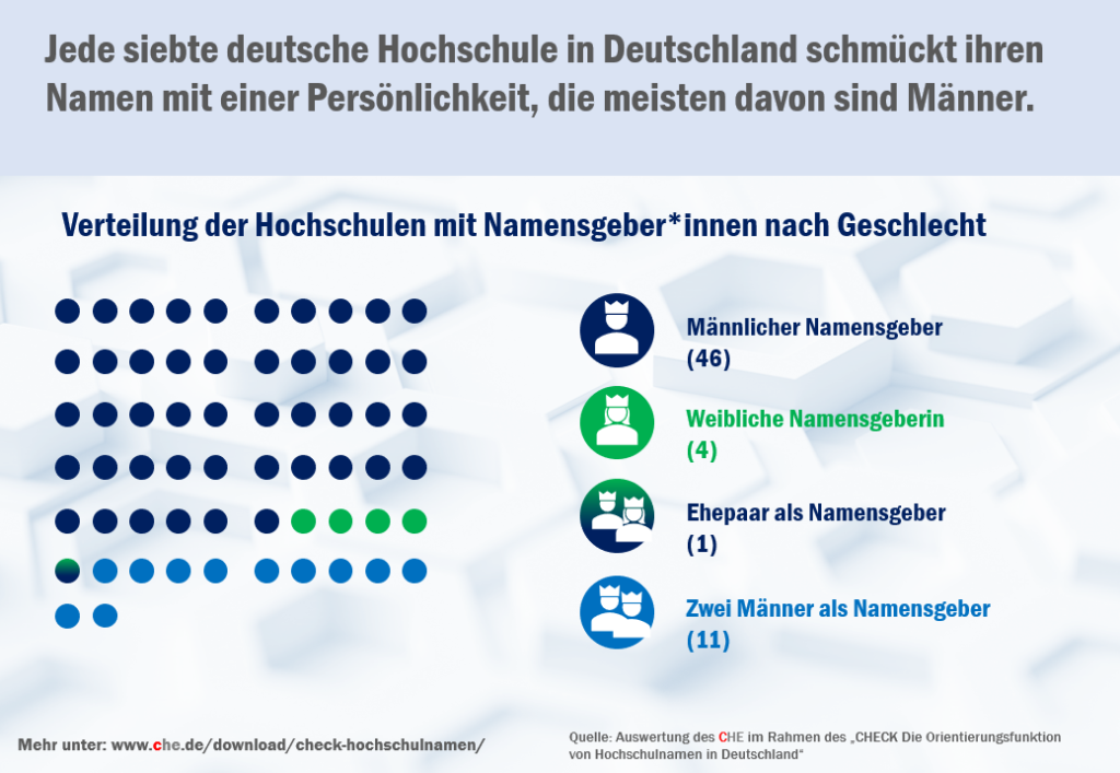 Rund jede siebte Hochschule in Deutschland verweist in ihrem Namen auf eine Persönlichkeit. Rein weibliche Namensgeber*innen gibt es aktuell vier, sowie eine Hochschule, die auf ein Gründerehepaar verweist. Englische Namensbestandteile (15 %) gehören ebenso wie Kürzel, Akronyme oder das Aufgreifen der Postleitzahl zur Vielfalt der Namensgestaltung deutscher Hochschulen. Den längsten offiziellen Namen hat die Fachhochschule für öffentliche Verwaltung, Polizei und Rechtspflege des Landes Mecklenburg-Vorpommern. Die geringsten Zeichenzahl weisen die hochschule 21 sowie die Hertie School auf.