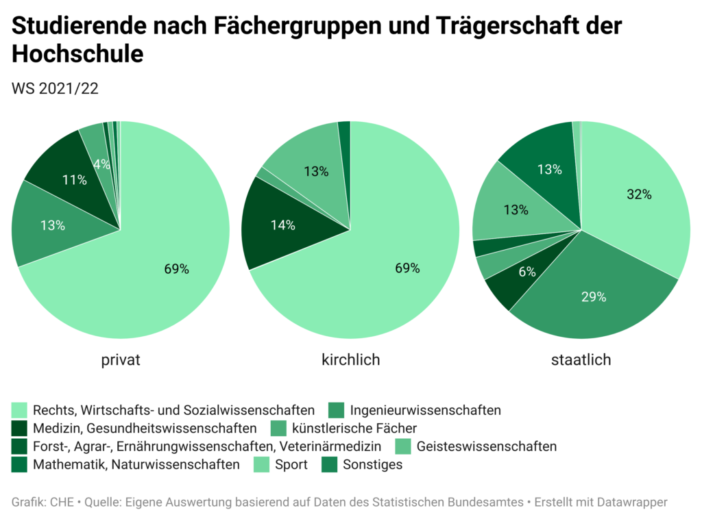 Sowohl private als auch kirchliche Hochschulen konzentrieren sich oft nur auf ein kleines Fächerspektrum vornehmlich aus den Rechts- Wirtschafts- und Sozialwissenschaften, aber auch Medizin/ Gesundheitswissenschaften bzw. Theologie und Kirchenmusik an den kirchlichen Hochschulen. Rund 80 Prozent der privaten und rund 45 Prozent der kirchlichen Hochschulen sind Hochschulen für angewandte Wissenschaften. Sie bieten nur selten mehr als 20 verschiedene Studiengänge an, während über 60 staatliche Hochschulen (mehrheitlich Universitäten) über 100 Studiengänge anbieten.