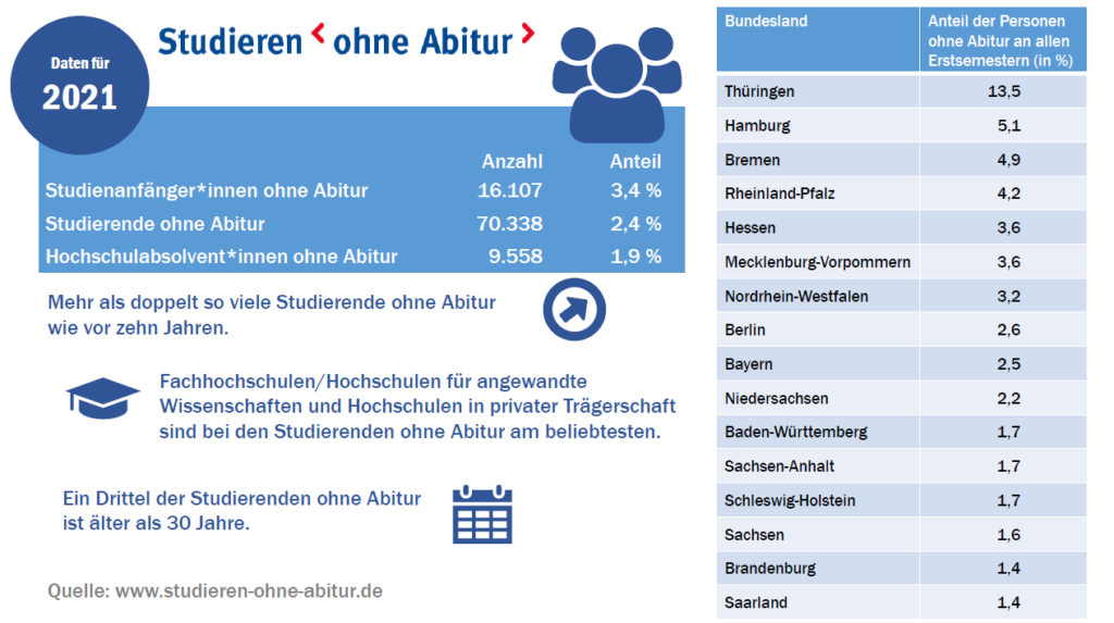 Seit 2011 hat sich die Zahl der Studierenden ohne Abitur in Deutschland von 32.200 auf 70.338 mehr als verdoppelt. Dies bedeutet im Zehn-Jahres-Verlauf einen neuen Höchststand und entspricht einem Anteil von aktuell 2,4 Prozent an der gesamten Studierendenschaft in Deutschland. Auch bei den Studienanfänger*innen (16.107; Anteil an allen Studienanfänger*innen bundesweit 3,4 Prozent) und Absolvent*innen ohne Abitur (9.558; Anteil 1,9 Prozent) sind im Jahr 2021 neue Höchstwerte zu verzeichnen.