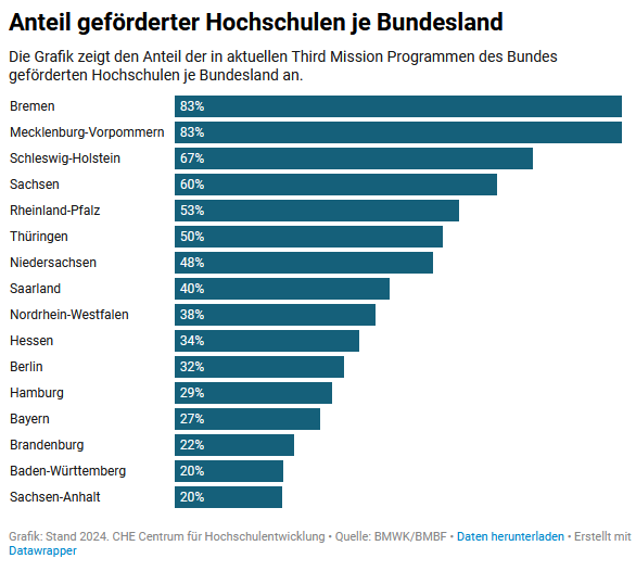 Aktuell wird die Third Mission, also Aktivitäten der Hochschulen, die über die klassische Forschung und Lehre hinausgehen, in sechs Förderlinien durch den Bund unterstützt. Mit 146 Einrichtungen ist rund ein Drittel aller deutschen Hochschulen daran beteiligt. Die Universität Bremen ist die Hochschule mit den meisten Beteiligungen an Förderprogrammen im Third-Mission-Bereich. Den höchsten Anteil geförderter Hochschulen im Bundesland gibt es in Bremen und Mecklenburg-Vorpommern. Dies zeigt ein DatenCHECK des CHE Centrum für Hochschulentwicklung.