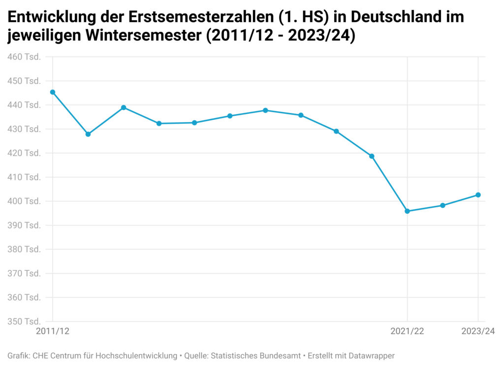 Seitdem haben sich die Zahlen wieder auf niedrigerem Niveau stabilisiert. Laut vorläufigen Zahlen des Statistischen Bundesamtes schrieben sich zum WS 2023/24 402.617 Personen erstmals an einer deutschen Hochschule ein. Dies entspricht einem Zuwachs von 1,1 Prozent gegenüber dem Vorjahr.