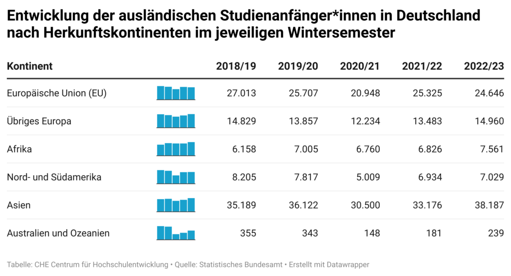 Mehr als 40 Prozent der internationalen Studienanfänger*innen in Deutschland stammen aus Asien. Mit rund 38.000 Erstsemestern liegt die Zahl sogar noch höher als vor dem Beginn der Corona-Pandemie. Die meisten ausländischen Studienanfänger*innen kamen 2022/23 mit 11.733 Personen aus Indien, gefolgt von China (5.661). Dabei ist auffällig, dass die Anzahl der Studienanfänger*innen aus Indien in den vergangenen Jahren stark gestiegen ist, die Zahl der Erstimmatrikulierten aus China hingegen rückläufig ist.