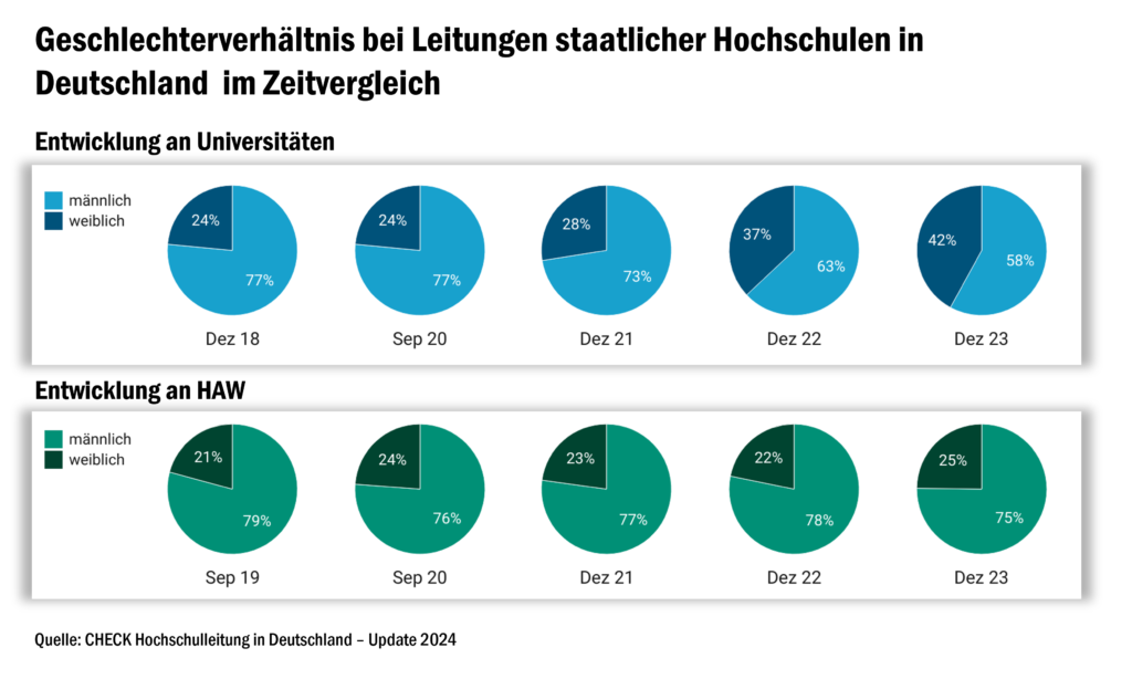 Rund ein Drittel der Leitungen staatlicher Hochschulen in Deutschland ist weiblich. Im Dezember 2023 lag die Frauenquote bei 32 Prozent. Sowohl beu den staatlichen Hochschulen für angewandte Wissenschaften (HAW) als auch bei den staatlichen Universitäten ist die Frauenquote sogar gestiegen. Jede vierte HAW (25 Prozent) hat eine weibliche Führungskraft, an den Universitäten sind es sogar 42 Prozent. Damit stieg die Zahl der Universitätspräsidentinnen und – rektorinnen im Vergleich zur ersten Auswertung des CHE im Jahr 2018 um 17 Prozentpunkte an.