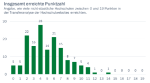 Keine der untersuchten Hochschulen erreichte die maximale Anzahl von 19 möglichen Punkten. Die höchste erreichte Punktzahl lag bei 14, und nur elf Hochschulen erzielten überhaupt zehn oder mehr Punkte. Bei fünf Hochschulen konnten keinerlei Informationen zu den ausgewählten Transferaspekten auf ihren Websites gefunden werden, weshalb sie null Punkte erhielten. „Die Ergebnisse werden bewusst anonymisiert veröffentlicht“, berichtet Isabel Roessler. „Es geht uns nicht darum, einzelne Hochschulen nach vorne zu stellen oder abzuwerten. Vielmehr steht im Fokus unserer Betrachtung, welchen Stellenwert das Thema Transfer insgesamt an den nicht-staatlichen Hochschulen einnimmt.“