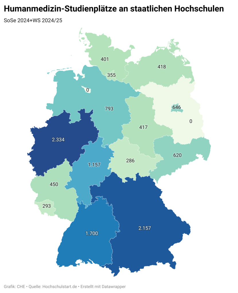 2024 standen Studieninteressierten an 40 Standorten staatlicher Hochschulen in Deutschland rund 12.000 Studienplätze zur Verfügung. Die meisten Erstsemester der Humanmedizin gab es in Nordrhein-Westfalen, Bayern und Baden-Württemberg.