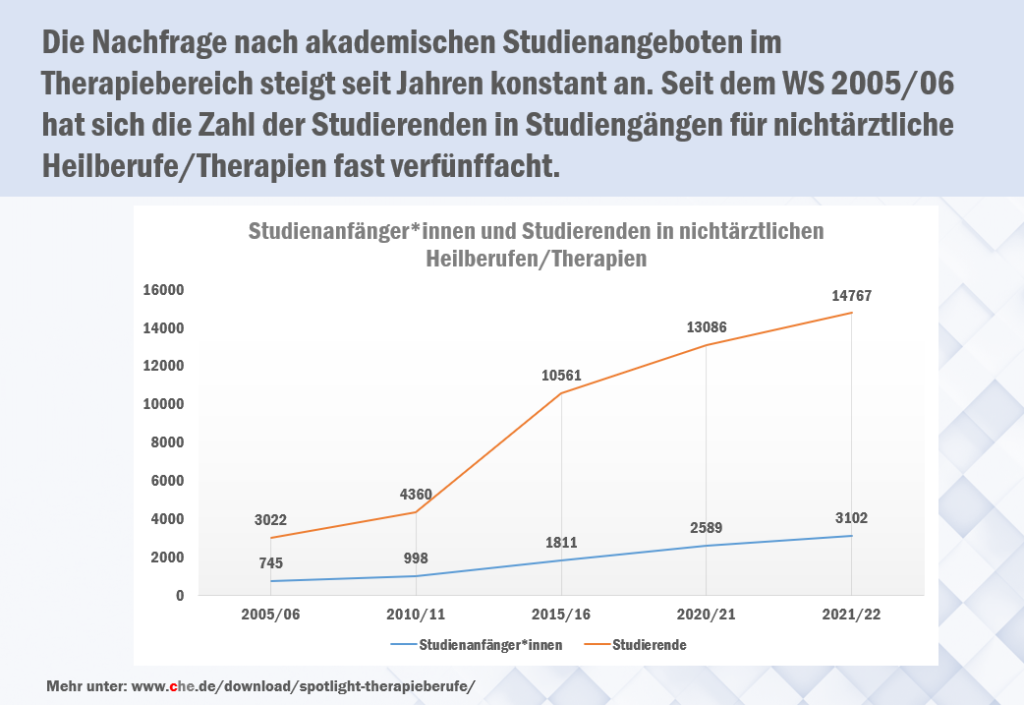 Eine Auswertung des CHE Centrum für Hochschulentwicklung im Rahmen eines Dossiers aus der Reihe DUZ Spotlight – Gute Praxis international zeigt für die bestehenden hochschulischen Angebote eine stark steigende Nachfrage. Zwischen den Wintersemestern 2005/2006 und 2021/2022 hat sich die Zahl der Studierenden in Studiengängen für nichtärztliche Heilberufe/Therapien fast verfünffacht. Aktuell sind in diesem Studienbereich rund 15.000 Studierende eingeschrieben.