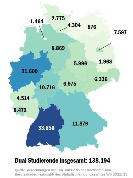 Die Auswertung der Daten des Statistischen Bundesamtes für den „CHECK – Duales Studium in Deutschland“ zeigt auf Ebene der Bundesländer große Unterschiede bei der Nachfrage. Mit rund 34.000 dual Studierenden ist Baden-Württemberg führend im Ländervergleich und stellt knapp ein Viertel aller Studierenden deutschlandweit. Mit deutlichem Abstand folgen Nordrhein-Westfalen und Bayern mit 22.000 bzw. 12.000 dual Studierenden.