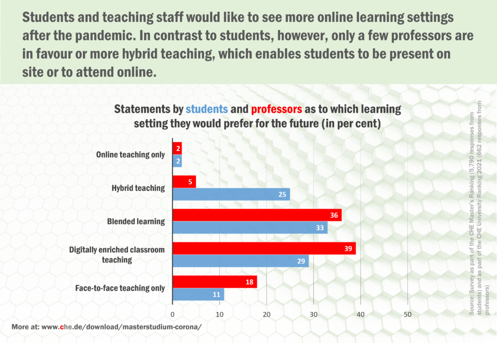 A similar desire for a mixture of face-to-face and digital elements was already apparent in a survey of professors in winter 2020/21, which was also conducted in the context of the CHE University Ranking. Student and faculty opinions differ most significantly when it comes to hybrid teaching, where participants can either be present on site or attend online. While hybrid teaching is a desirable future scenario for as many as 25 per cent of students, it is not the future method of choice for teaching staff (5%).