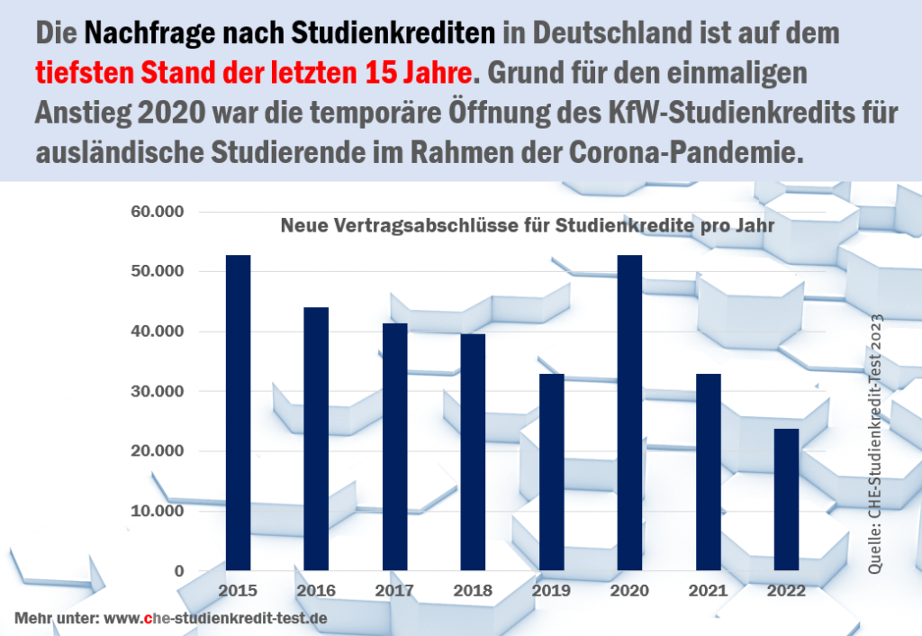 Foto: Bruno / PixabayThe number of new student loans taken out in Germany fell to an all-time low of just 23,820 contracts in 2022. At the same time, the interest rate charged by the market leader hit a peak of around eight per cent. Ulrich Müller, expert on student funding at the CHE Centre for Higher Education, considers the market for student loans to be on the verge of becoming insignificant – with severe consequences for students. These are the findings of the annual evaluation conducted as part of the CHE Student Loan Test 2023.