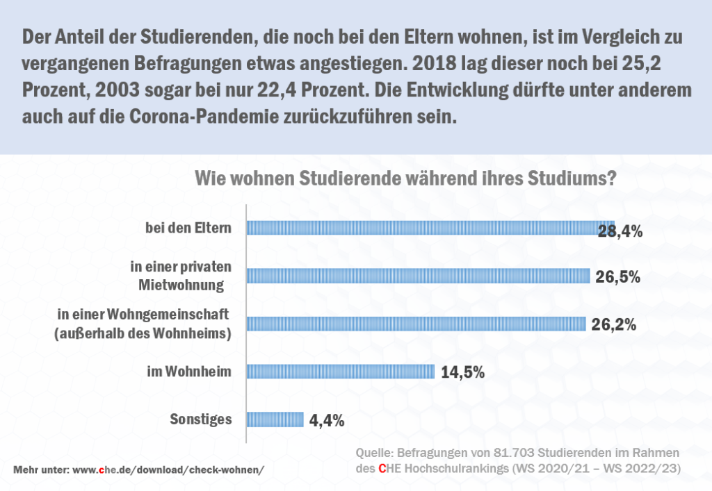 “Above all, students of universities of applied sciences and vocational academies based in small cities and municipalities are more likely than average to be still living with their parents. Shared apartments, on the other hand, are particularly popular in medium-sized university cities,” stated the author of the study Marc Hüsch, highlighting striking features of the analysis of residential arrangements. “No doubt the unique challenges posed by the Covid-19 pandemic also play a role,” remarked Hüsch. After all, survey data from the winter semesters 2020/21, 2021/22 and 2022/23 was taken into account for the analysis.